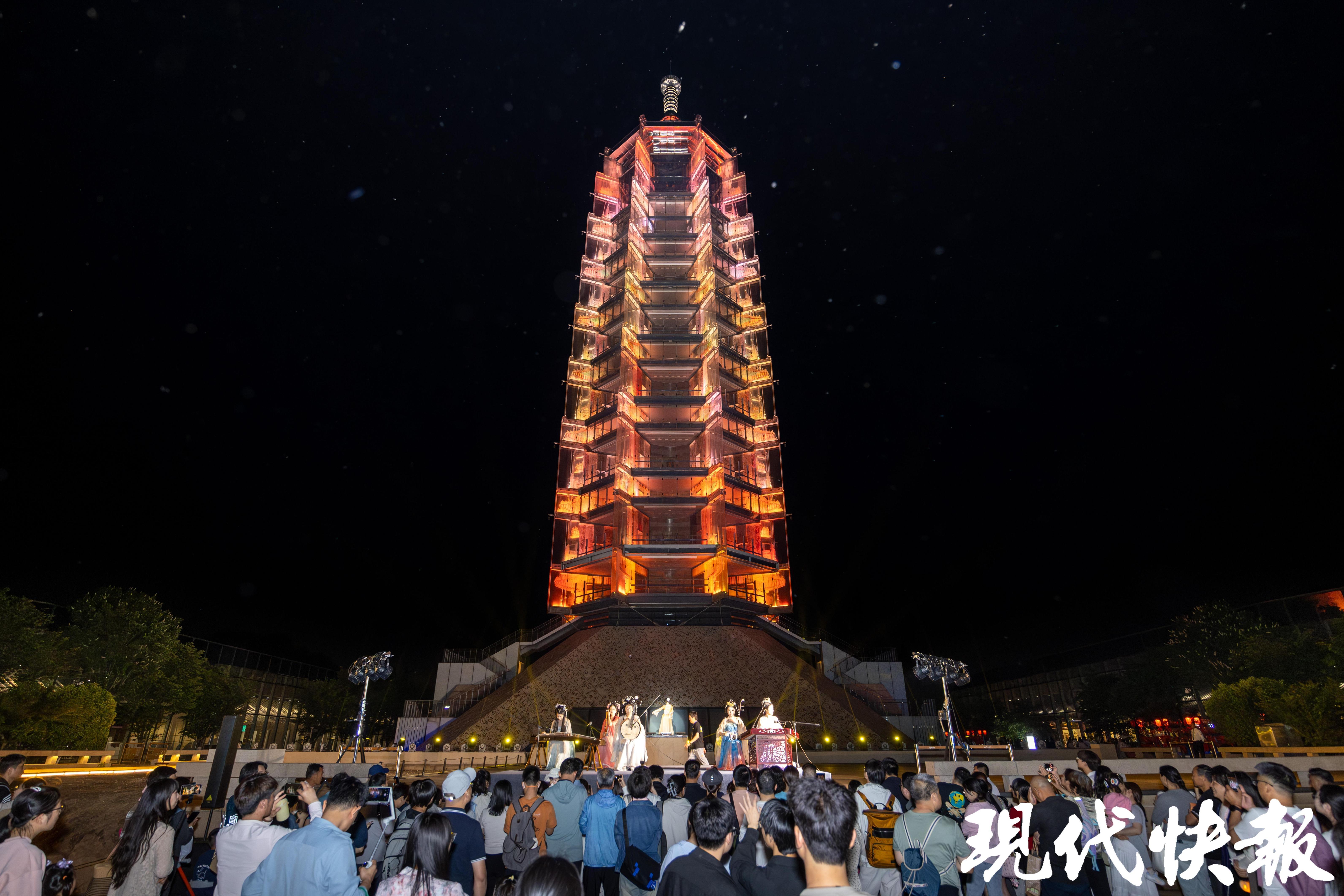 演出中还通过真人演员声如洪钟的旁白、起雾造雪的实景特效、晨钟暮鼓的环绕音效、康熙为塔身题字等情节演绎,让观众仿佛穿越回大明盛世,收获沉浸式视听体验。